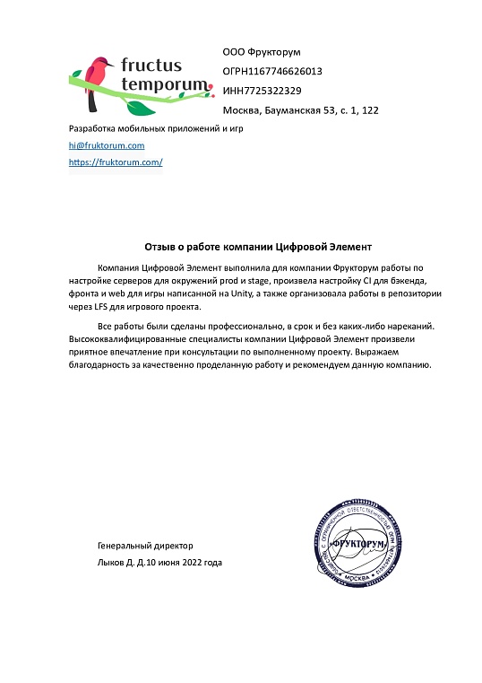 Компания Цифровой Элемент выполнила для компании Фрукторум работы по настройке серверов для окружений prod и stage, произвела настройку CI для бэкенда, фронта и web для игры написанной на Unity, а также организовала работы в репозитории через LFS для игрового проекта. Все работы были сделаны профессионально, в срок и без каких-либо нареканий. Выражаем