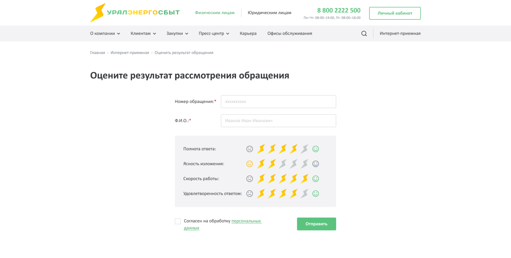 Все обращения разделены на темы, за каждой темой закреплен ответственный сотрудник Уралэнергосбыта. У пользователей есть возможность отправить свое обращение через сайт, не приходя физически в офисы Уралэнергосбыта. Для этого им необходимо выбрать тему обращения и заполнить все необходимые поля в появившейся форме.