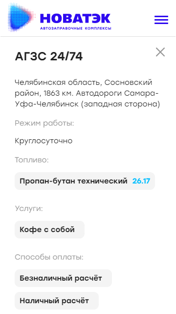 На странице Сети АЗС пользователь может по выбранному местоположению увидеть на карте точки заправочных станций, причем можно отсортировать станции по виду топлива. При нажатии на конкретную станцию будет предоставлена информация: наименование станции, адрес, режим работы, виды топлива, дополнительные услуги и способы оплаты. Все данные приходят из Базы данных Oracle.