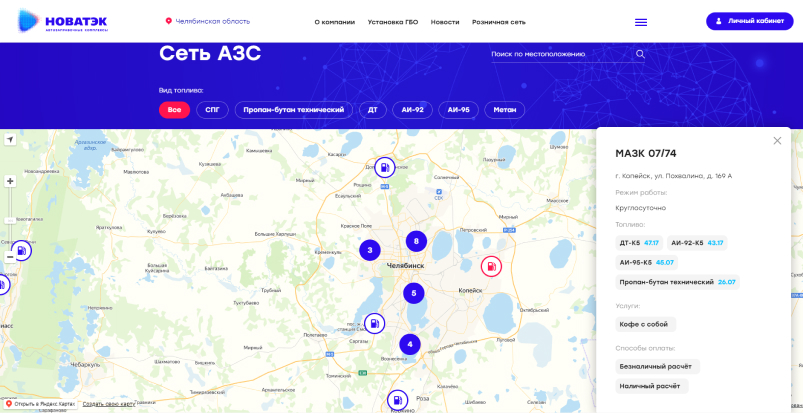• Создание на сайте интерактивных карт с поиском партнерских центров и заправочных станций