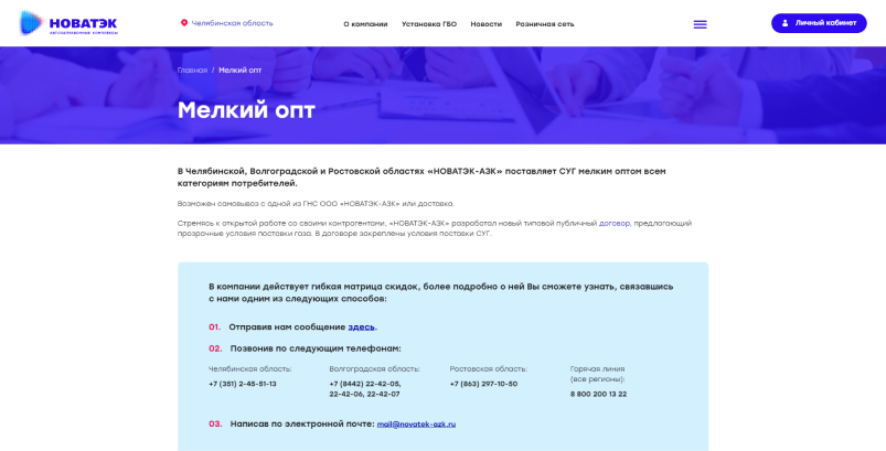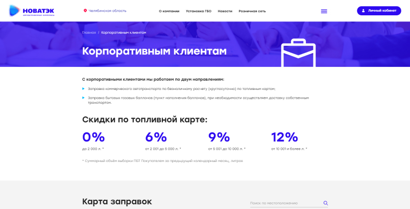 На страницах корпоративным клиентам и мелкий опт пользователи могут ознакомиться с условиями заключения договора и пакетом документов для физических и юридических лиц, увидеть на карте заправки по местоположению и видам топлива, либо газонаполнительные станции, а также скачать договор для прочтения и заключить договор с помощью формы обратной связи.