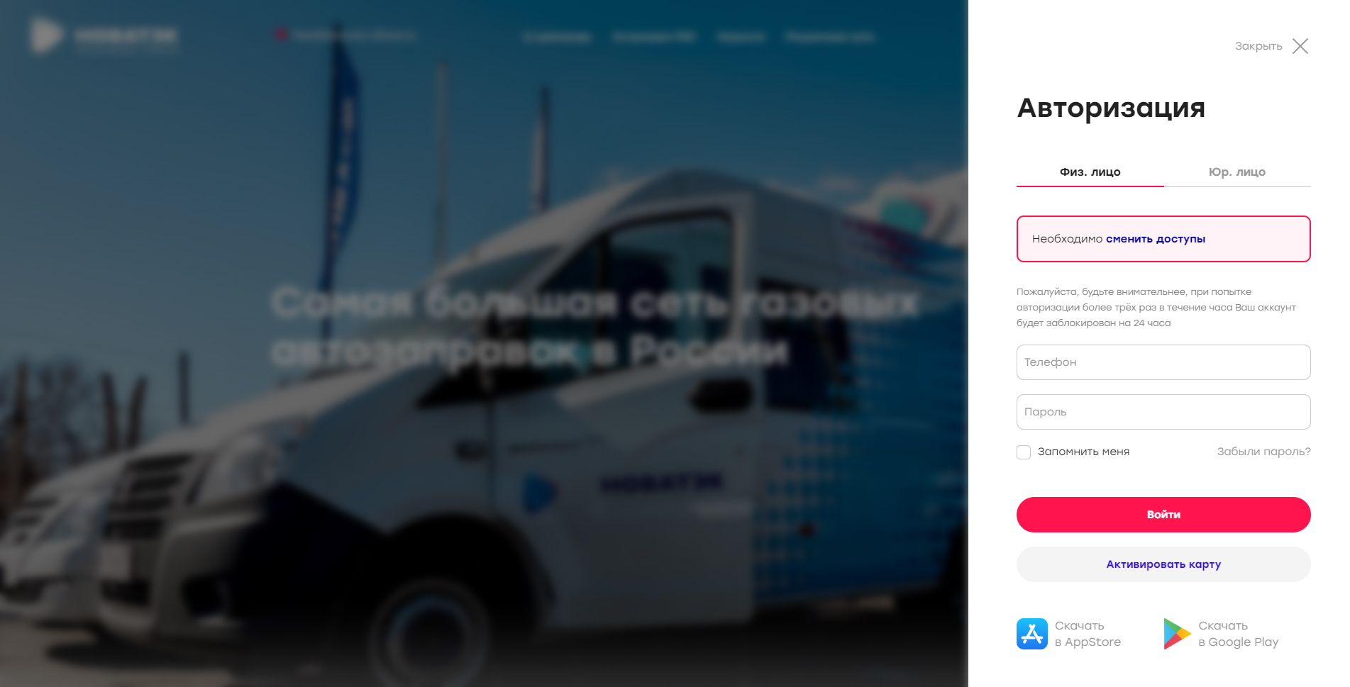 На сайте реализован личный кабинет для физических и юридических лиц, в котором пользователи могут увидеть свои данные по карте, бонусы, список своих покупок по дате и месту, а для юридических лиц есть возможность контроля всех своих заправочных карт, с возможностью зачисления денежных средств. Чтобы войти в личный кабинет необходимо иметь физическую карту АЗС «НОВАТЭК», либо иметь заключенный договор с компанией «НОВАТЭК-АЗК».