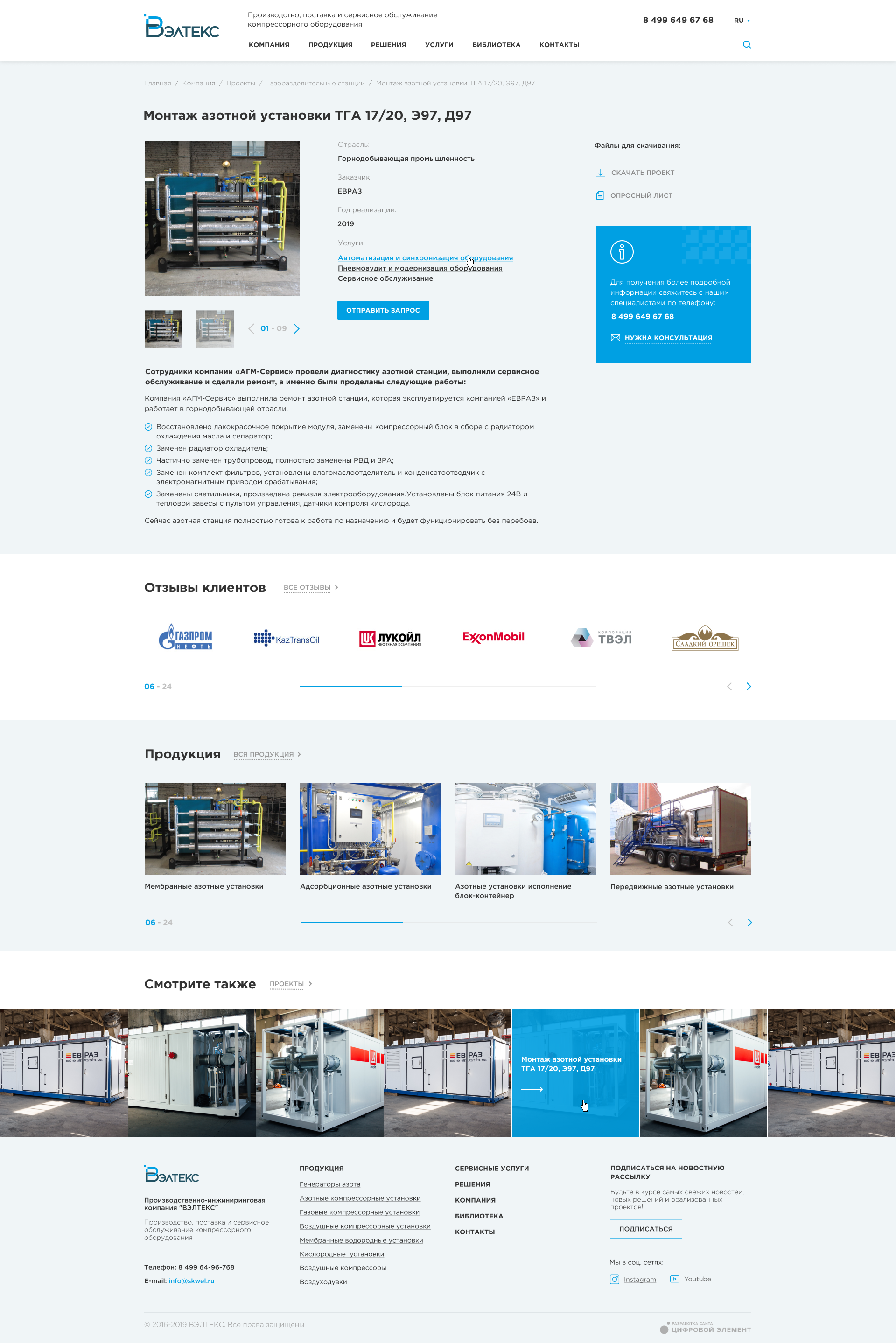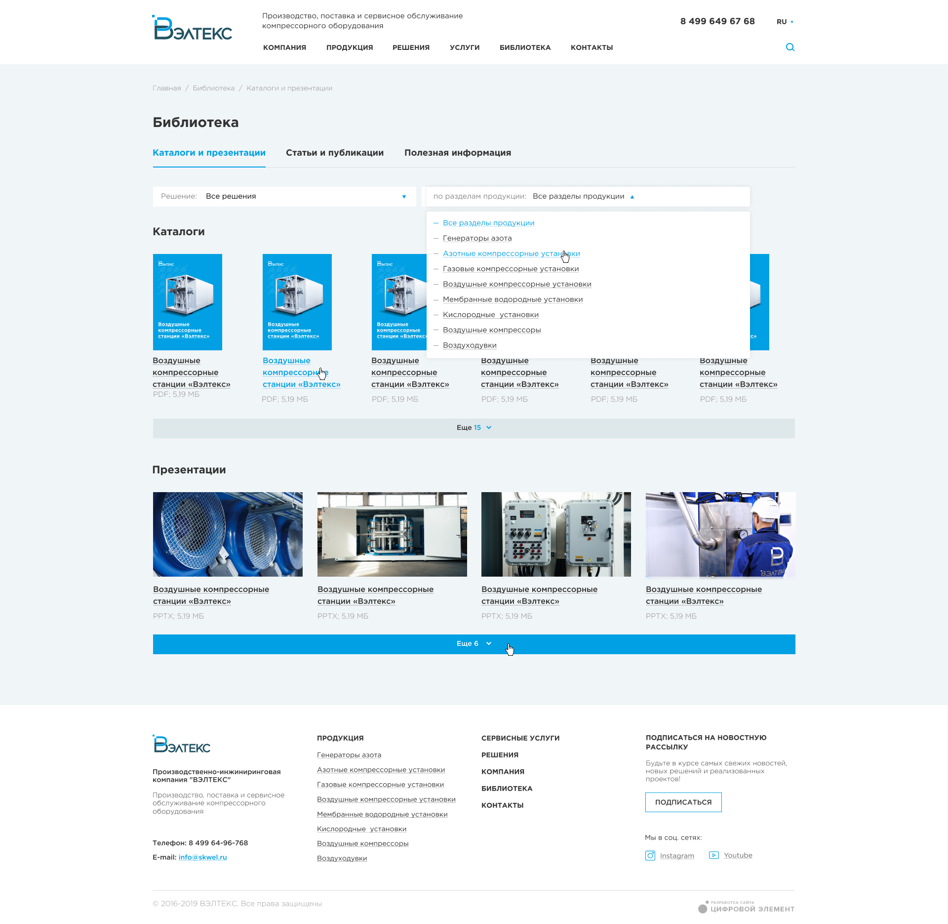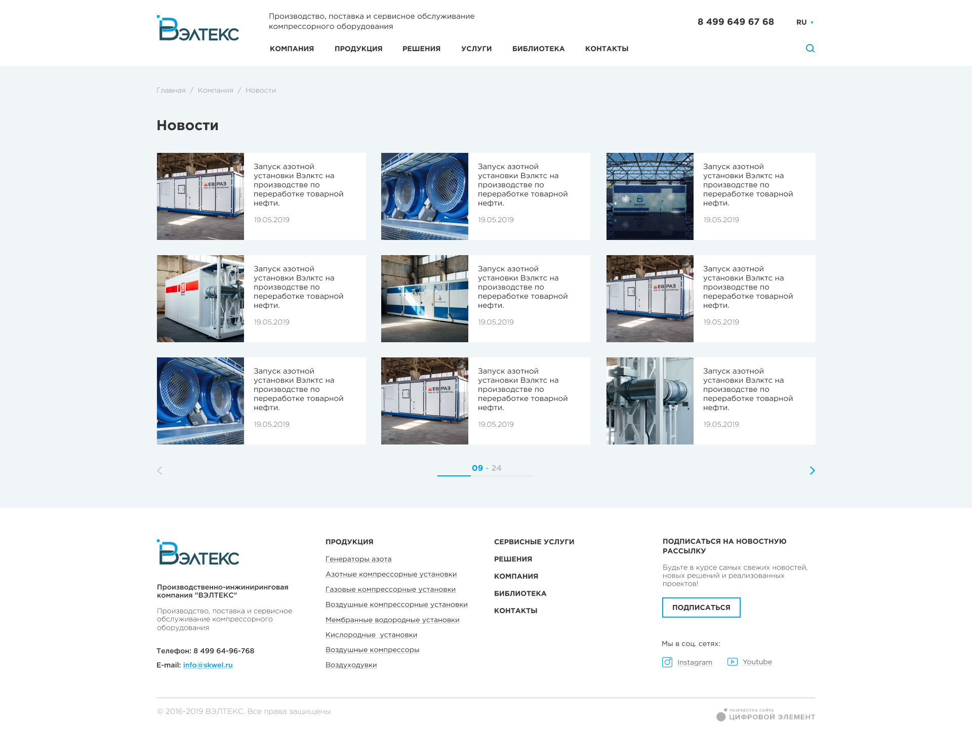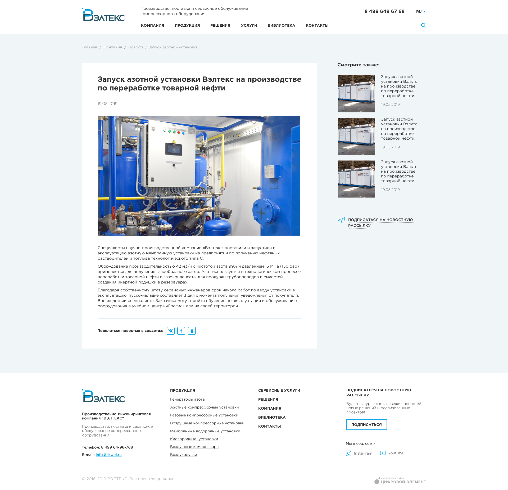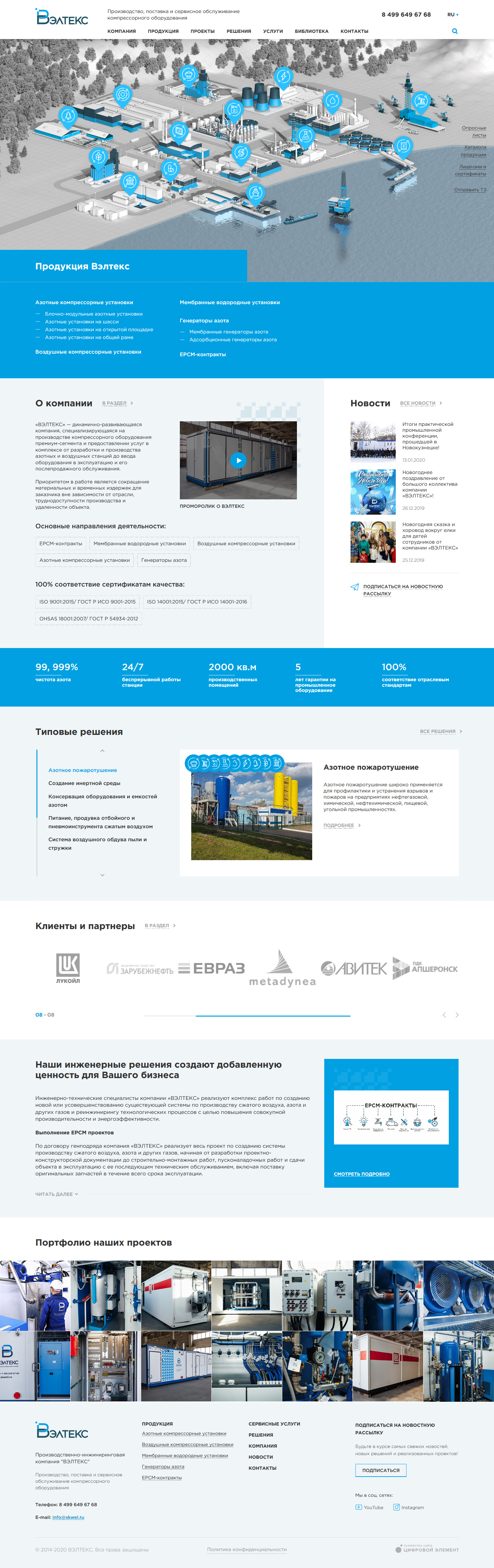 «ВЭЛТЕКС» — динамично-развивающаяся компания, специализирующаяся на производстве компрессорного оборудования премиум-сегмента и предоставлении услуг в комплексе от разработки и производства азотных и воздушных станций до ввода оборудования в эксплуатацию и его послепродажного обслуживания.
